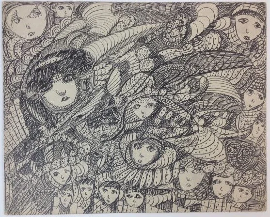 Madge Gill (Londen, Engeland, 1882-1961) werkt steeds in trance, bezeten door de geest ‘Myrninerest’. Onder invloed van deze kracht maakt ze grote tekeningen in Indische inkt op lange rollen (sommige zijn 11 meter lang), begint ze te breien, te weven en te borduren en schrijft ze spiritueel ingeblazen muziekstukken. Haar tekeningen zijn gevuld met vrouwenfiguren gevat in dichte, rusteloze webben van lijnen die er een duizelingwekkend perspectief aan verlenen.